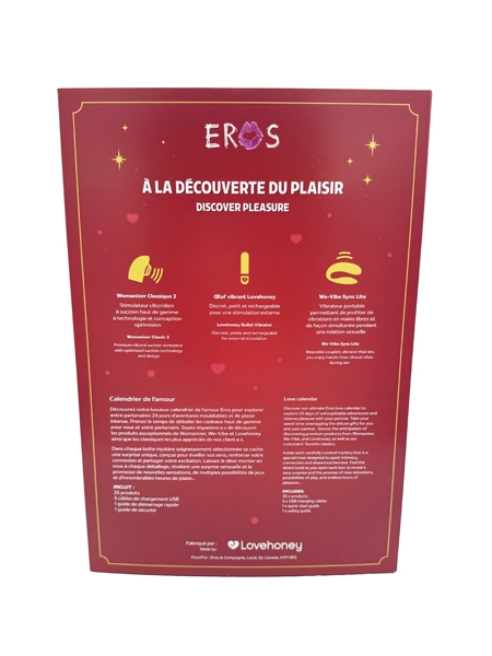 Découvrez la 3ᵉ édition tant attendue du calendrier de l’Amour Eros, repensée pour séduire même les plus fins connaisseurs du désir. Cette année, plongez dans un univers d’érotisme raffiné grâce à une collaboration exclusive avec Womanizer, We-Vibe et Lovehoney — les marques les plus prestigieuses du plaisir intime.